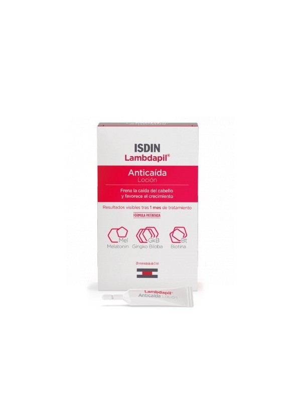 PRIMERA FÓRMULA PATENTADA QUE ACTÚA CREANDO UN MICRO-AMBIENTE PROTECTOR DEL FOLÍCULO PILOSO.PROMUEVE EL CRECIMIENTO DE NUEVOS CABELLOS, FAVORECE LA FASE ANÁGENA Y RETRASA LA APOPTOSIS CELULAR GRACIAS A LA MELATONINA, UN POTENTE ANTIOXIDANTE QUE NEUTRALIZA LOS RADICALES LIBRES.ACTIVA EL FOLÍCULO PILOSO MEJORANDO EL APORTE DE NUTRIENTES GRACIAS AL GINGKO BILOBA.NUTRE Y FORTALECE. MEJORA LA ESTRUCTURA Y AUMENTA EL GROSOR DEL CABELLO GRACIAS A SU CONTENIDO EN BIOTINA.MODO DE USOAPLICAR EL PRODUCTO MEDIANTE UN SUAVE MASAJE SOBRE EL CUERO CABELLUDO SECO ANTES DE ACOSTARSE.APLICAR 1 MONODOSIS DIARIA DE 5 A 7 DÍAS POR SEMANA DURANTE 3 MESES.PARA OBTENER ÓPTIMOS RESULTADOS, CONTINUAR CON EL TRATAMIENTO DE LAMBDAPIL ANTICAÍDA LOCIÓN DURANTE OTROS 3 MESES.COMPOSICIÓNMELATONINA, GINKGO BILOBA Y BIOTINA